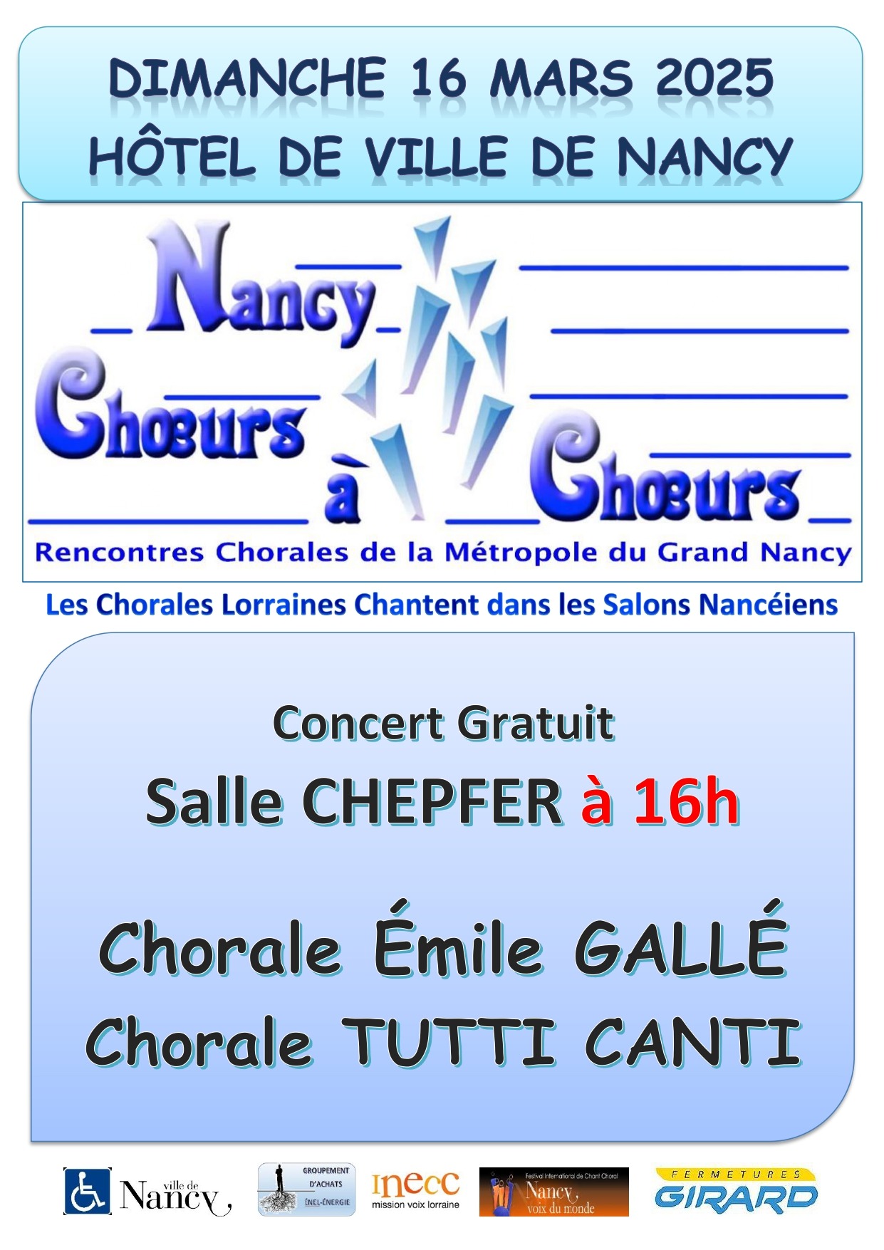 Dans le cadre du programme Nancy Choeurs à Choeurs, la chorale Emile Gallé sera en concert ce dimanche 16 mars à 16h00, dans la salle Chepfer de L'Hôtel de Ville de Nancy !